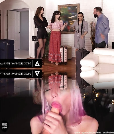 Once Caught On Cuckold, a Brunette Tranny Has To Please 2 Lusty Plump Busty Redheads Wit Her Dick