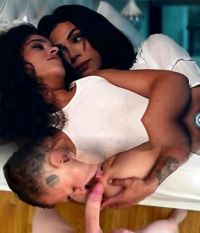 Fat cock trans Mairana Cordoba and meaty stiffy trans TaniaQ share a guy and his ass letting him deep-throat them both off and then fuck