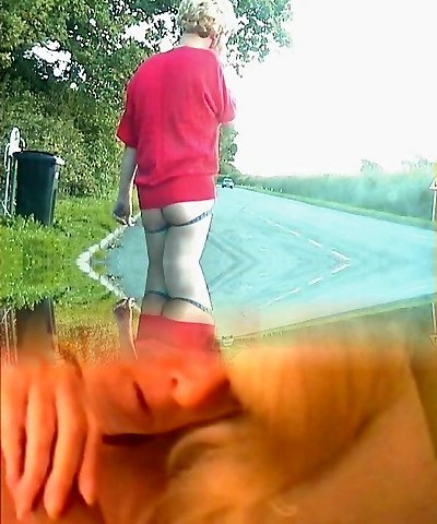 Amateur Crossdresser Kellycd2022 sexy milf masturbating gigantic cumshot in white seamless pantyhose and heels outdoors
